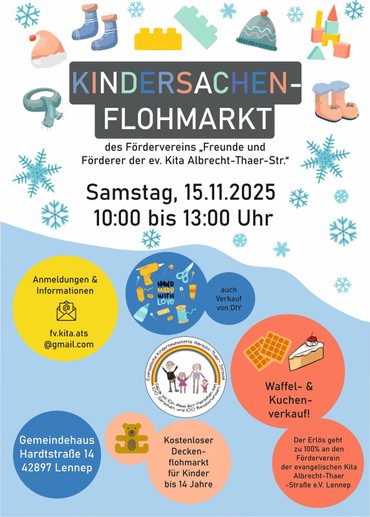 Der Förderverein Freunde & Förderer des Ev. Kindergartens Albrecht-Thaer- Straße e.V. lädt Sie herzlich zu unserem Flohmarkt ein, der sich auf Kindersachen und DIY Artikel konzentriert. Nutzen Sie die Gelegenheit, um sich auf die bevorstehende Winterzeit vorzubereiten!